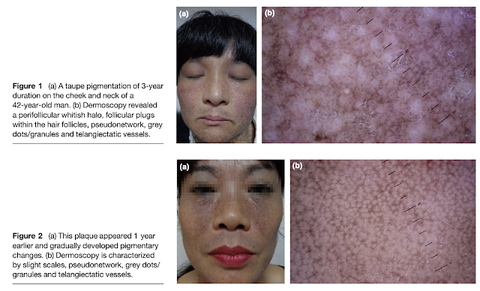 Hình ảnh quan sát được dưới Microscopic cho thấy hình ảnh giả mạng lưới, các hạt màu xám, giãn mạch, ngoài ra có thể thấy tình trạng tróc vảy, nút keratin nang lông...
